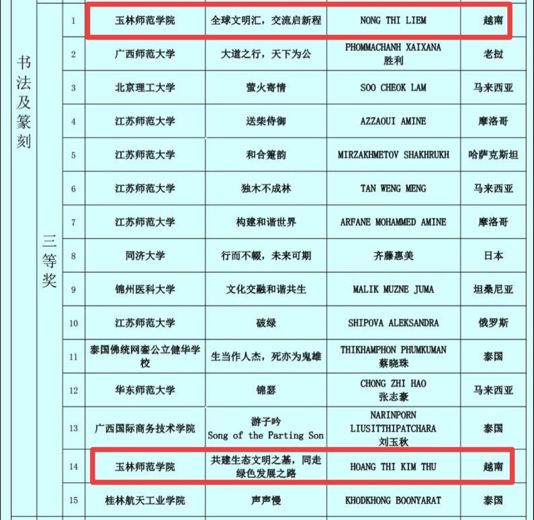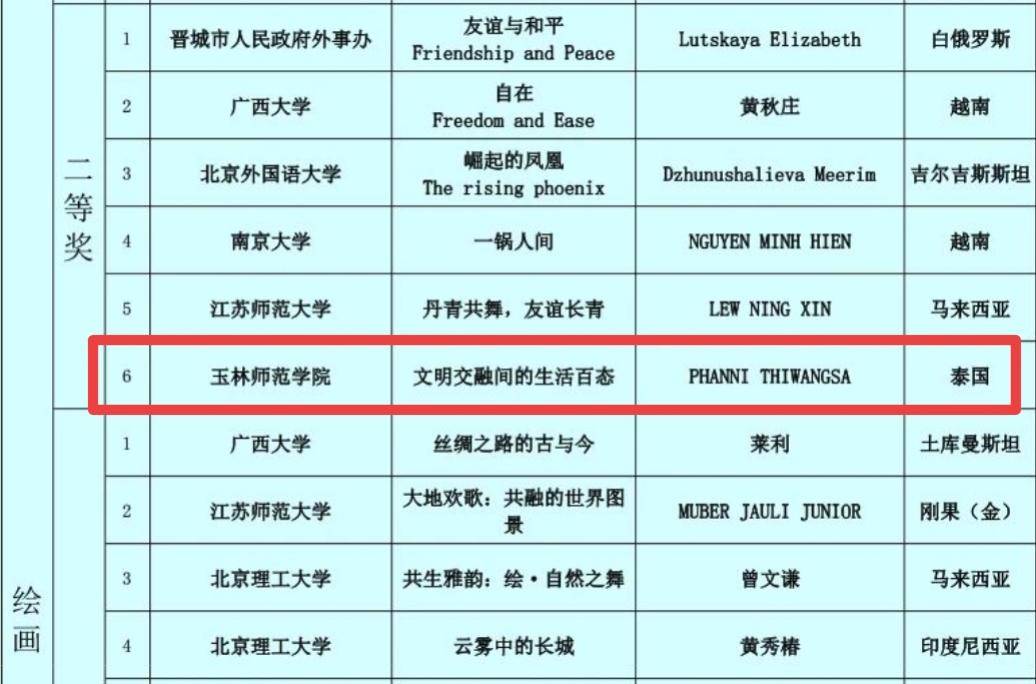 近日,第二届“美美与共青年笔汇”获奖名单公布,玉林师范学院留学生喜获佳绩。泰国籍学生PHANNI THIWANGSA(金丽敏)的作品《文明交融间的生活百态》荣获绘画组二等奖,越南籍学生NONG THI LIEM(农氏廉)的书法作品《全球文明汇,交流新启程》和HOANG THI KIM THU(黄氏金舒)的书法作品《共建生态文明之基,同走绿色发展之路》荣获书法及篆刻组三等奖。
