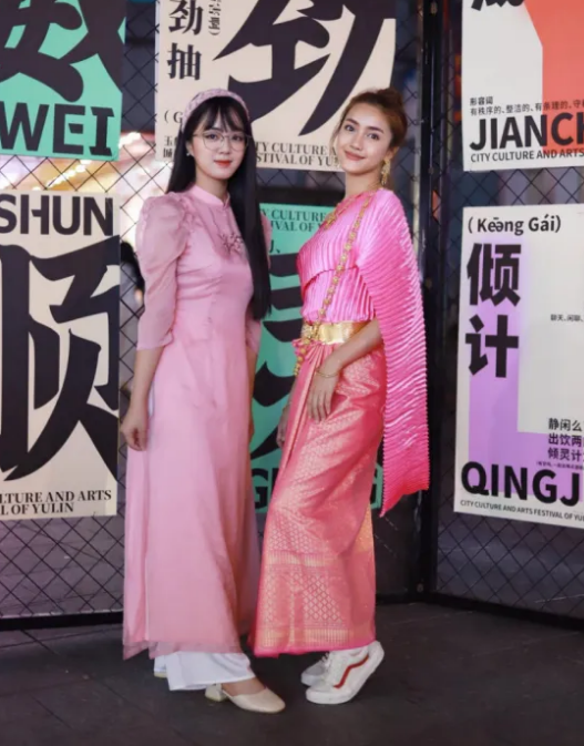 黄氏金舒在玉林十字街和朋友拍照